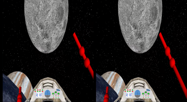 The spaceship application can be modified to compensate for this deformation by using the Model View Matrix available from one of the property nodes of a 3D Picture control in LabVIEW. The Model View Matrix of the 3D picture controls of each eye must be multiplied by a scaling matrix (affine transformation):