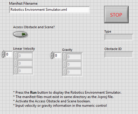 In order to do so, this example will load up the reference to a manifest file and access the simulator engine via a property node. The Obstacles are picked and indexed in order to access the first one; should the manifest file have more than one obstacle, you must simply switch the input to the Index Array. A property node gets the ID for the obstacle as a string which is then passed to the Get Obstacle Reference polymorphic VI. You may alternatively wire the string directly if the ID of the obstacle is known.