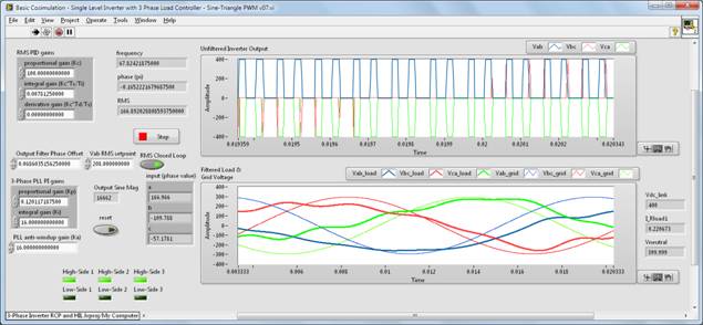 システムシミュレーション用のグラフィカルインタフェースには、ユーザが定義したPID制御用のパラメータと、可変RMS出力設定値、出力フィルタの位相オフセット、PLLのゲインの各項目が設けられています。出力線間電圧と送電電圧の比較結果がリアルタイムで視覚化されて表示されます。