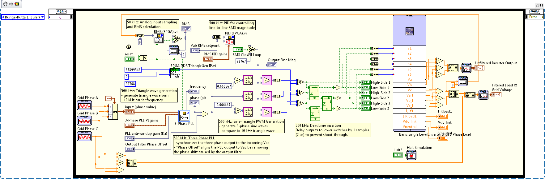 LabVIEWの制御用VIには、複数のブロックが含まれています。それらのブロックは、いずれも500 kHzで動作する制御系設計とシミュレーションループ内に配置されます。それぞれのブロックは、設計フローのダイアグラムに含まれる動作のうち、いずれか1つを実行する役割を担います。