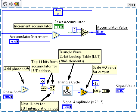 Figure 7. Triangular Wave Generator VI and Block Diagram