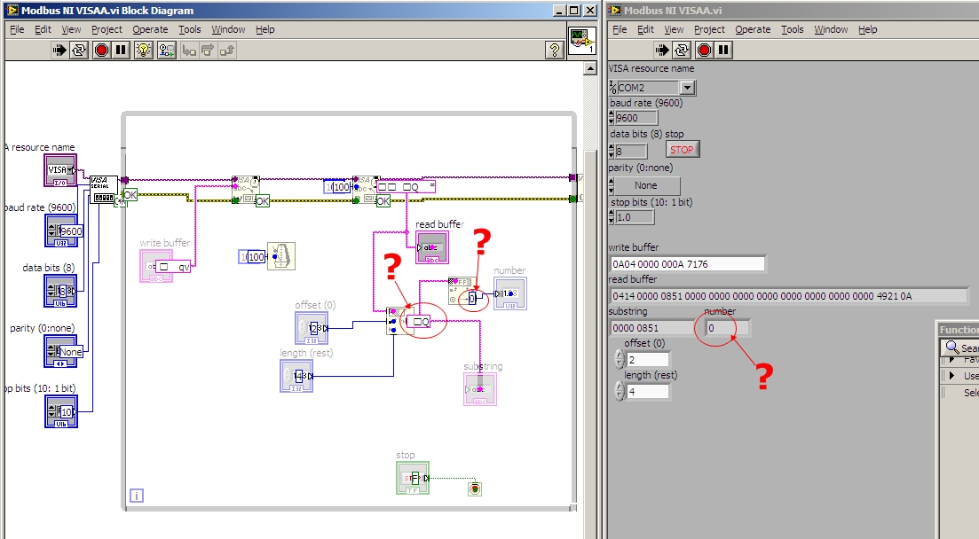 Data mengalir dari PC-->USBRS485-->Modbus-->USBRS485-->PC kan ga instant. Cara-nya, pakai Flat Sequence Structure, taruh Wait(ms) di dalam, letakkan di antara VISA Write dan VISA Read. Pastikan error cluster masuk dan keluar Flat Sequence Structure.