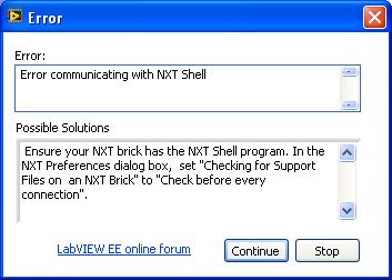 I usually get following message: "Error communicating with NXT Shell" (http://forums.ni.com/t5/image/serverpage/image-id/23722i52D00D5FFE31ACEA/image-size/original?v=mpbl-...)