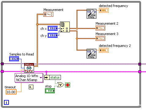 but i noticed that the sample frequency measure program requires the DAXmx read.vi set to 1D waveform to measure frequency not 2D DBL like the rest of my program. I think it is where this part i'm having problems with sampling all my inputs ai8 to ai13.