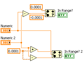 I'm not using floating point values, and I've tried changing the precision and the representation. Recall, I said that the same comparison works on it's own in another VI. I don't know if it has something to do with its position in the loop in the IV or what. I've got it working now, had to do some minor conversions. As far as I can see there's something involved somewhere which is introducing FAR more precision than needed, but it's been taken care of.