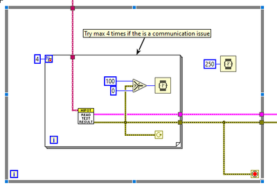 It was not mentioned before but I use this VI to communicate with a GPT-9803 HIPOT tester instrument via USB. During the test we ramp up the voltage to couple kV (DC), then keep it steady for couple sec and finish the test. The instrument will respond to our query with a string indicating the current voltage, the current test time, a test in progress flag and a Pass/Fail flag. The instrument controls this porcess on its own, so losing the connection doesnt mean it will not shut the test down properly.