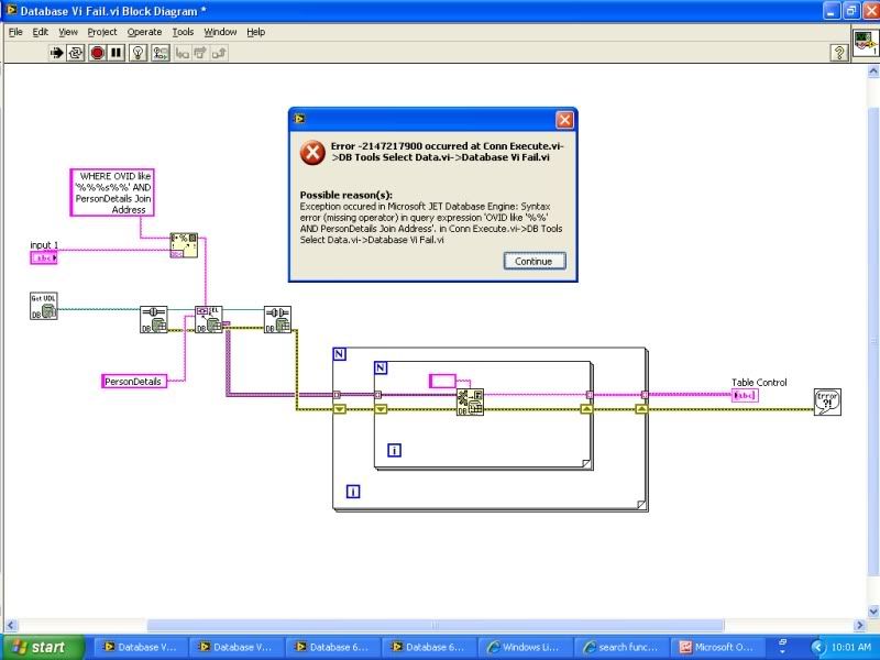 Hi, i have seen the link which smercurio_fc posted when i tried to join the tables together. I have also used the join clause when i started learning about database design using oracle. i have design a query yesterday after reading up about ms access. Im currently thinking of using macro with activex to display my data. do you have any example regarding using labview sql query or using macro ms access with activex for labview? i have the relationship between the 2 tables done. i read through the ms access book but i could not find the method to use access to show me the correct sql syntax.
