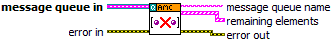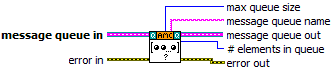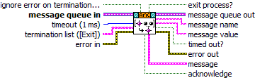 The Read Next Message VI is used to retrieve the next message from the message queue to be handled in the local process. The message queue is passed in by queue reference as it will be created in the same process.
