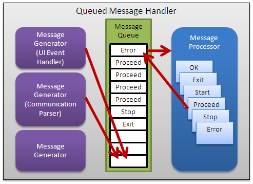 When developing a queued message handler, there are a number of possible ways to define the message stored in the queue. Common implementations include strings, variants and enumerations. Each of these choices offers different advantages and disadvantages.